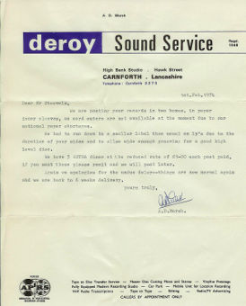 | After a production delay of almost a year this letter from Deroy Sound Service finally announced delivery. |